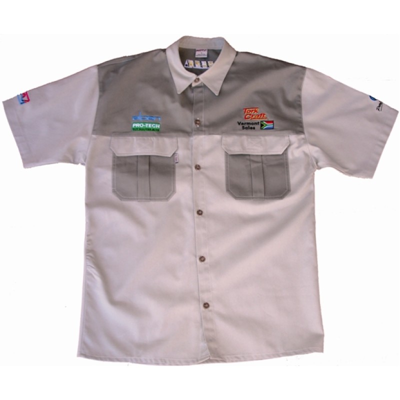 The shirt represents the Vermont Sales company. The leading brands are embroidered on the sleeves and the chest.