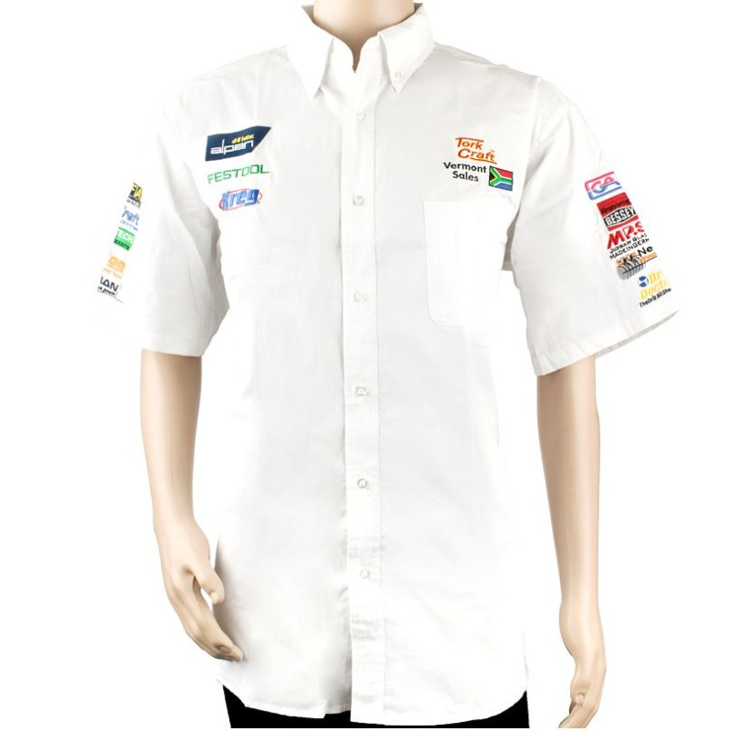 The shirt represents the Vermont Sales company. The leading brands are embroidered on the sleeves and the chest.