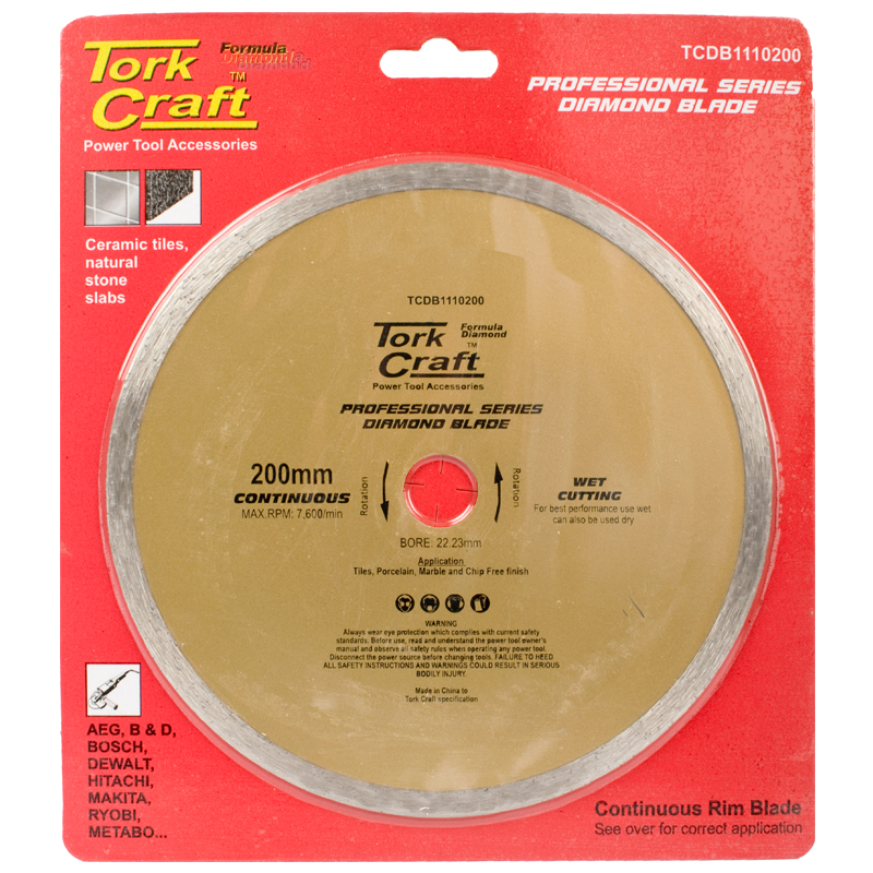 Professional Series Diamond Blade with Continuous Rim (non-segmented) for cutting ceramic tiles and natural stone slabs. Standard 22.23mm bore size to fit all makes of angle grinders.