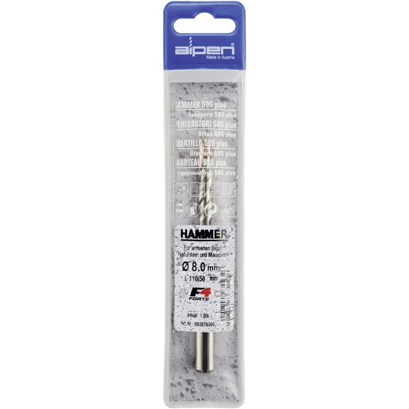The SDS-plus hammer drill bit F4 with its patented 4X stepped profile and patented tip. Low wear, very long service life.