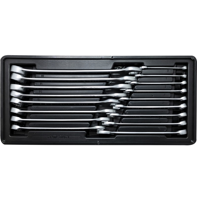 Insert for tool our tool cabinets. 1/3 drawer size, 17 piece. The set consists of a set of combination wrenches in sizes 6 - 22 mm. High quality chrome vanadium steel ensures reliability and long-lasting work. Manufactured in accordance with DIN 3113 standard.